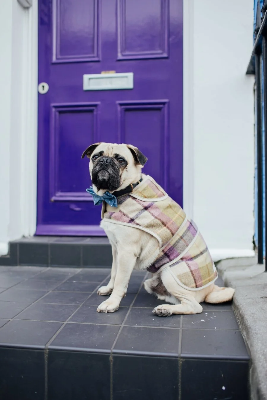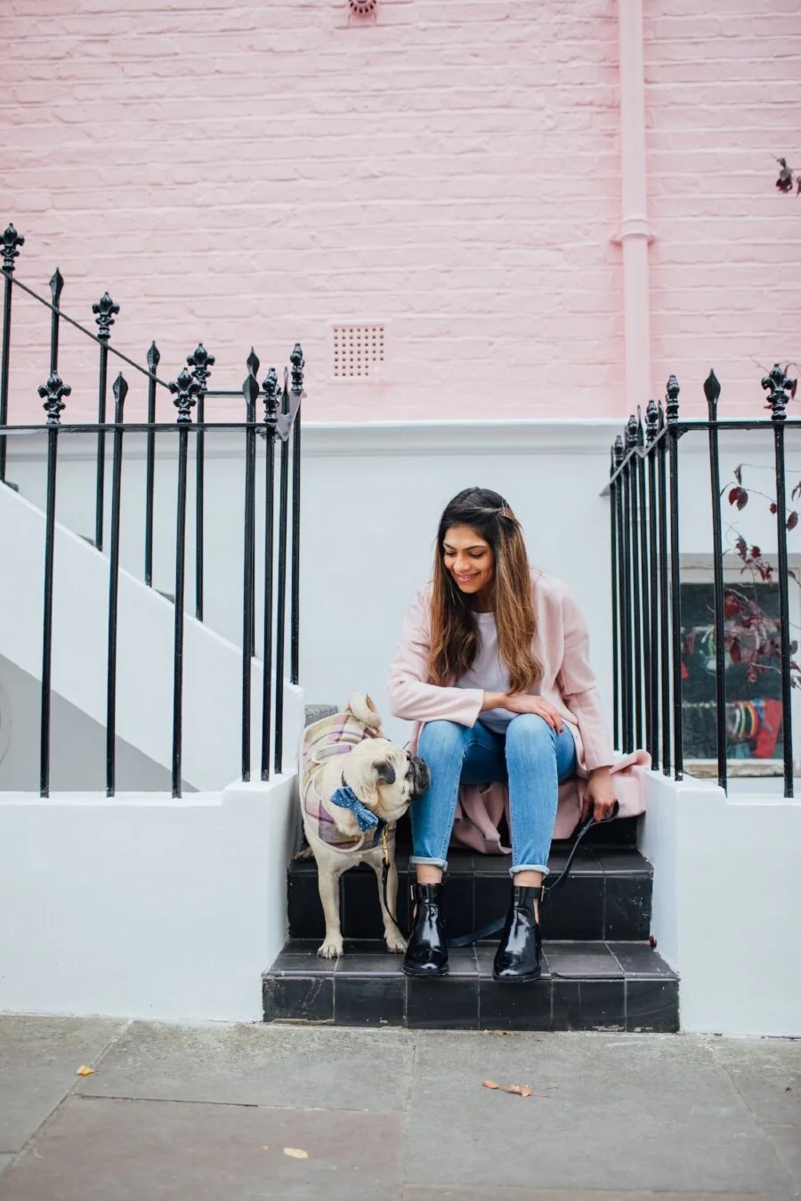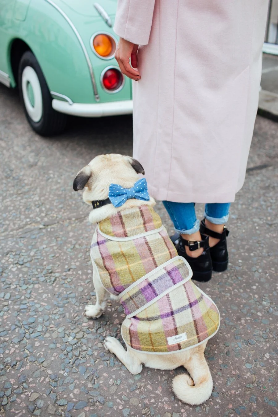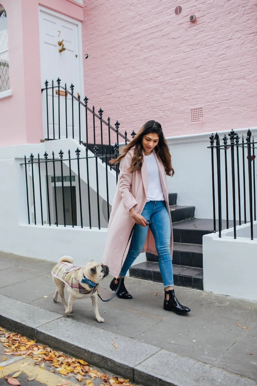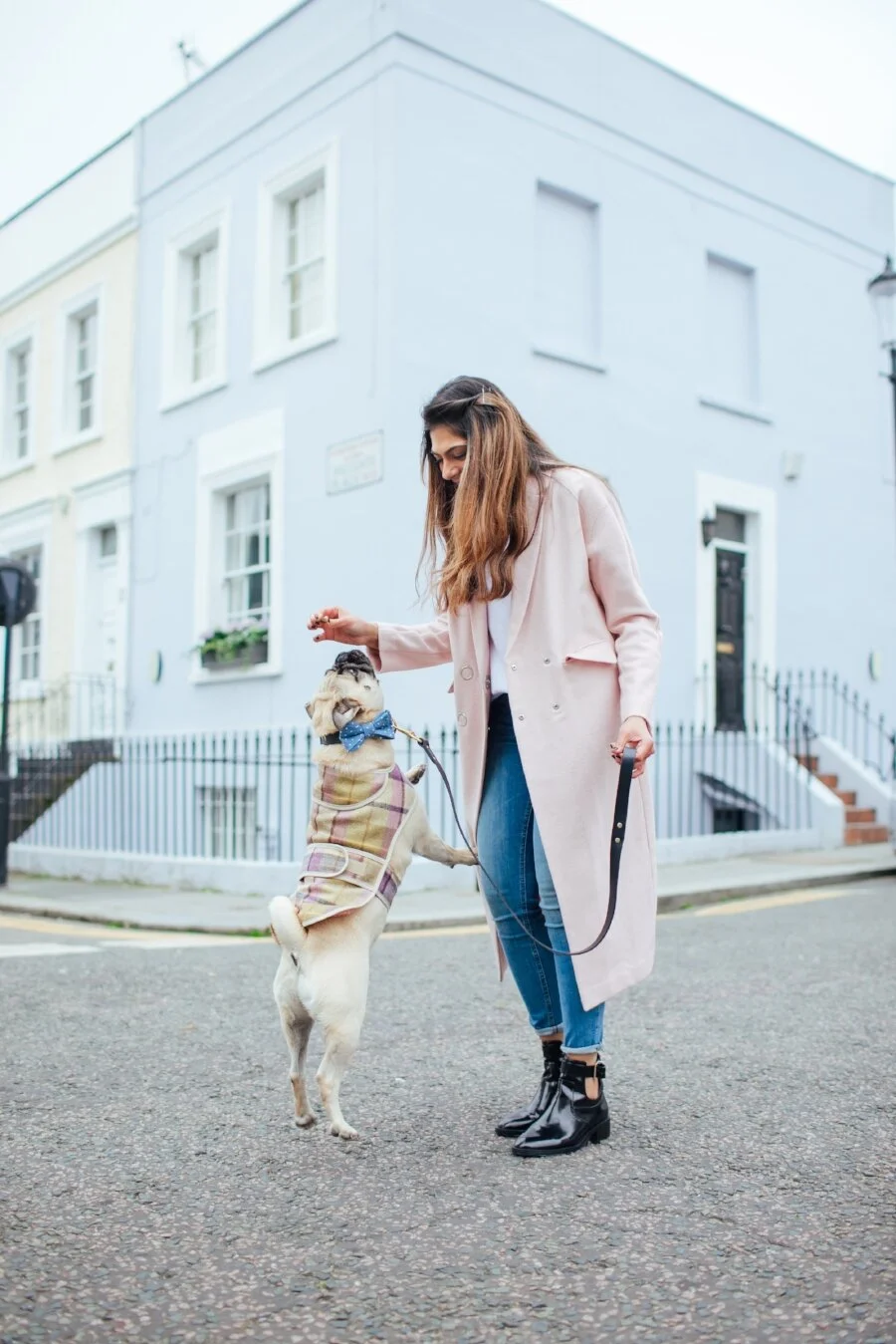 Pastels in pink and other colours have been all over the catwalks for AW16. Looks like these are not just summer colours anymore. Create interesting fall looks by combining pink coats with accessories in shades of metallic, burgundy or other darker colours. I decided to combine my pink coat with flat black ankle boots to toughen it up a bit. Ari's winter coat from Hettie & Co in mixed shades of pastels and neutrals completed our human and hound look.