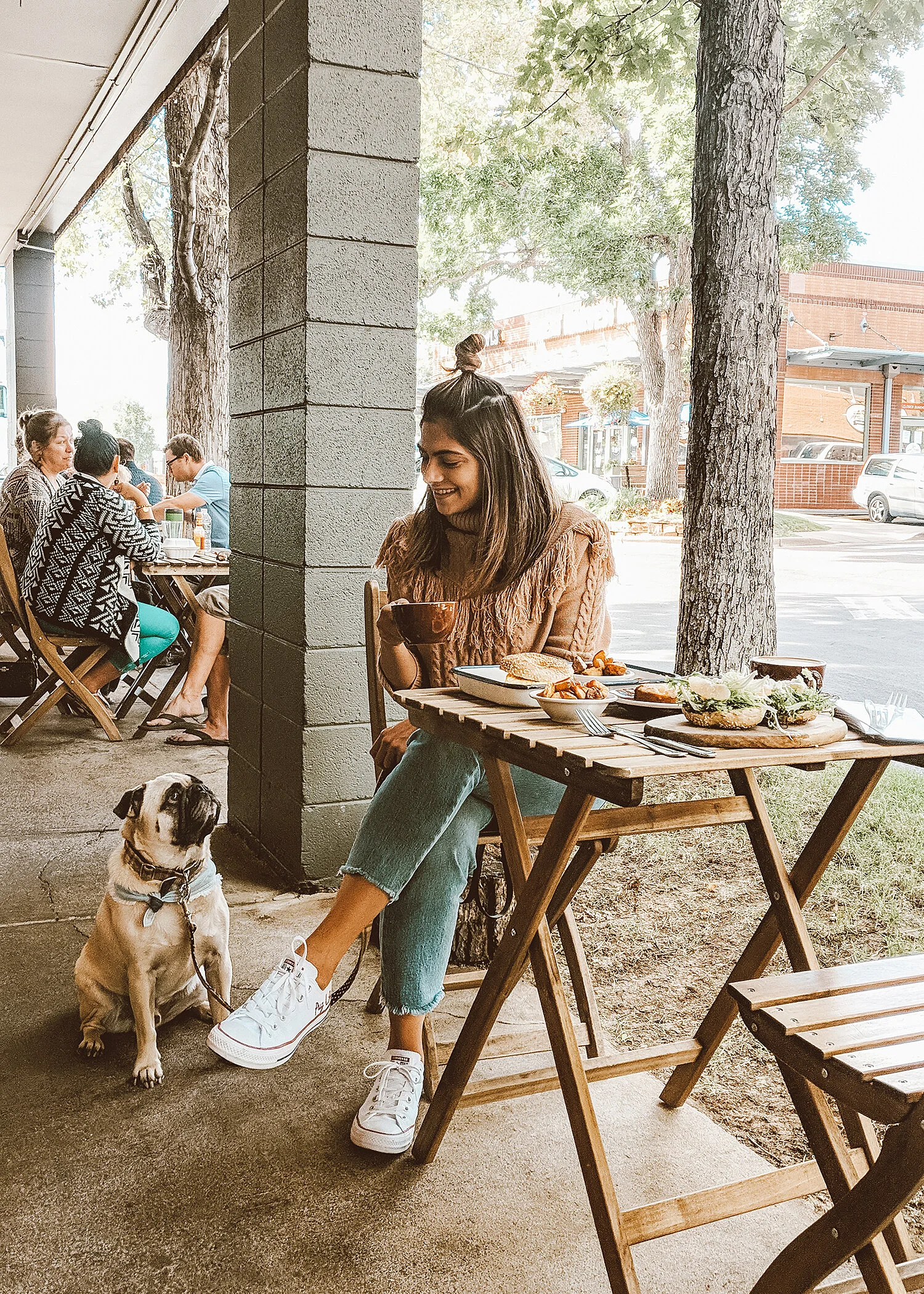 We started with Pearl Street, a pretty cobblestone street lined with cute cafes, restaurants, bars, and stores on both the sides. Unfortunately, on the cobblestone section of Pearl Street, dogs aren’t allowed on the patio. We walked further ahead on Pearl Street and beyond the cobblestone section we found Eureka. Dog friendly, great beer, great staff and amazing food. Since my husband and I are both vegetarians, we tried some of their veggie options. Cauliflower Bites with Garlic Aioli and Veggie Beet Burger were super delish!