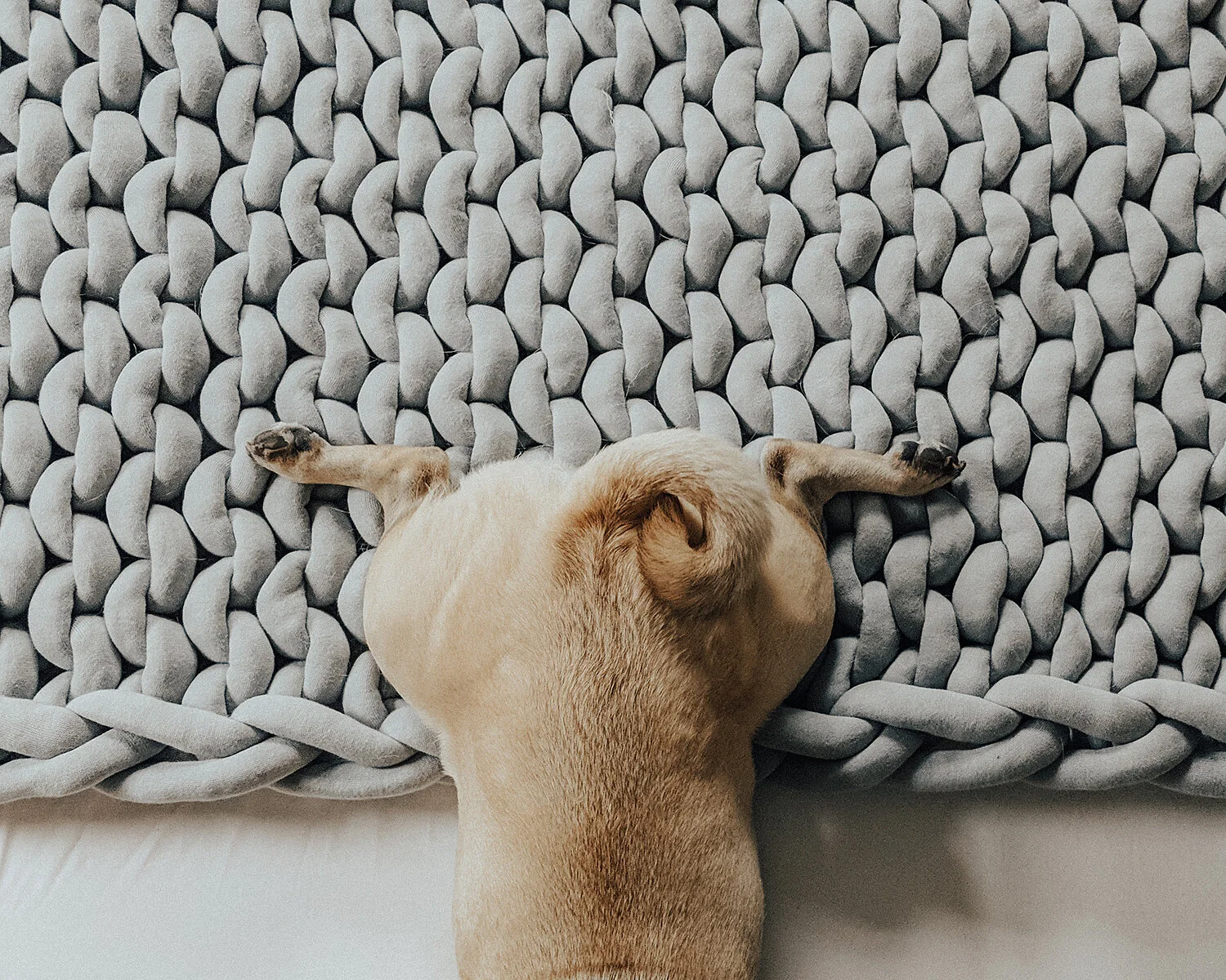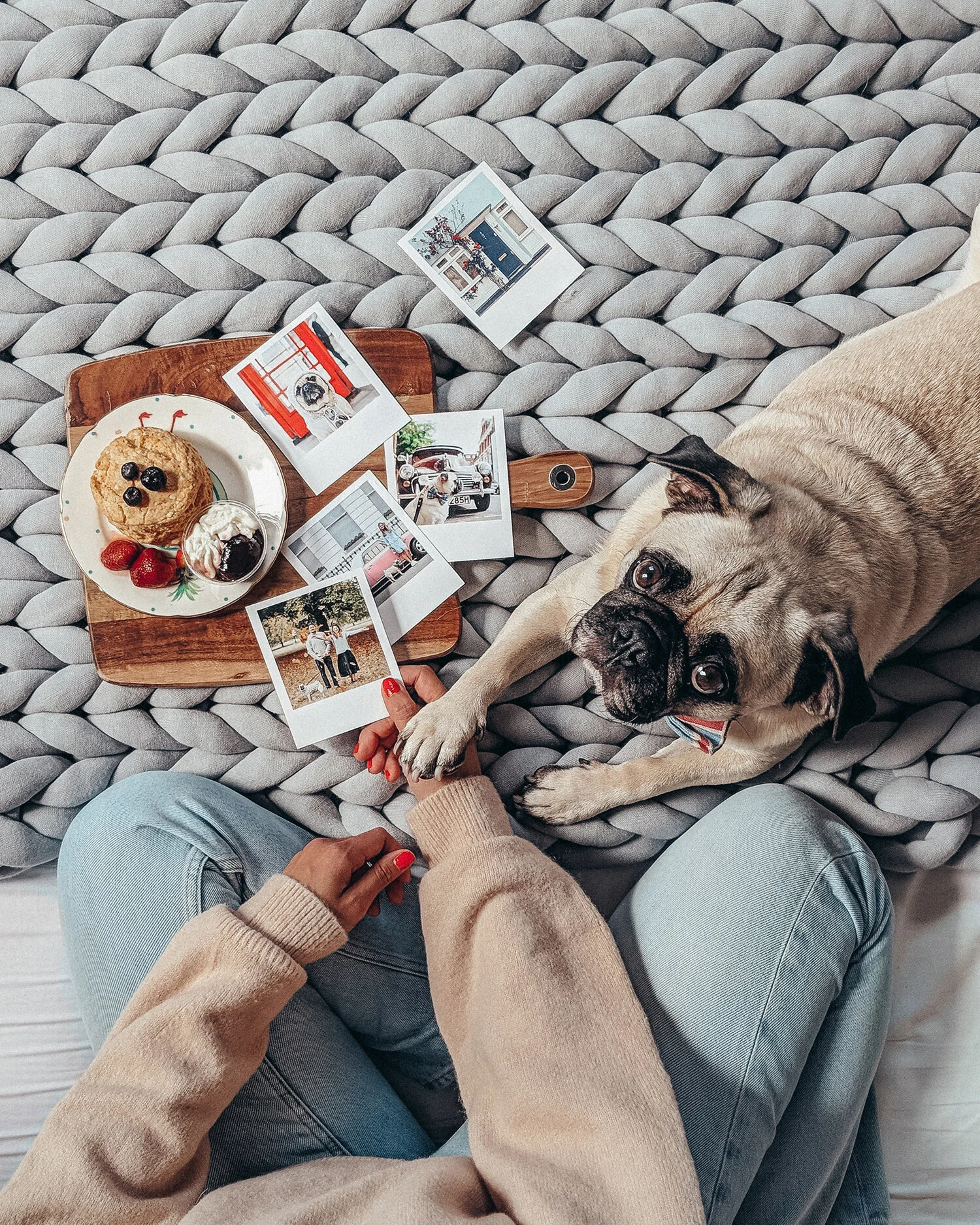 While Ari enjoys his bed, we humans get to enjoy the plush blanket. We chose a pink bed to add a pop of color to our living room, but we went with a neutral color for the blanket so it works with most of our linen. It just makes everything look so beautiful. As fall has officially kicked in, we have been using it to tuck in our feet while watching TV or while sleeping. Sometimes I also leave it on my work chair to keep me toasty while writing. I just love how versatile, beautiful and soft this blanket is! Ari of course wiggles his way into it every so often :)